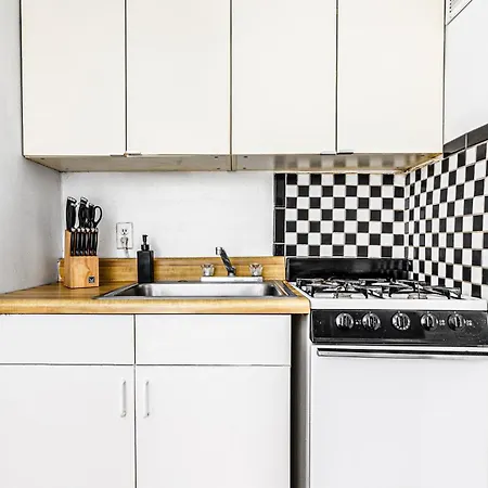 The apartment is equipped with self-catering facilities, including a kitchen with an electric kettle, tea and coffee making equipment, and glassware. The nearest 9th Avenue & West 46th Street bus stop is right near this property.