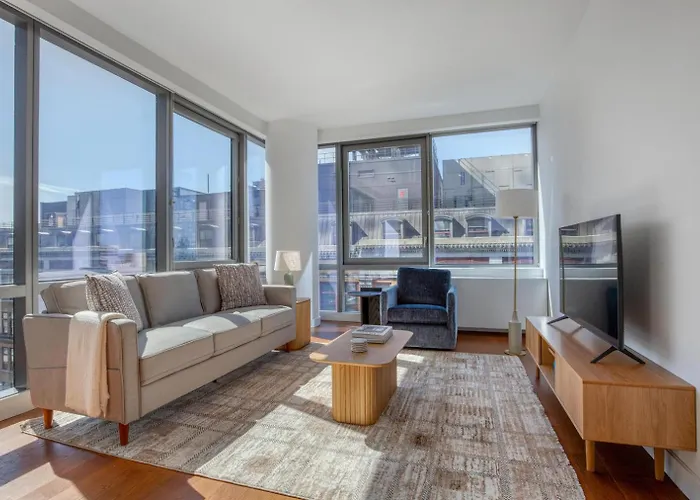 Blueground Hudson Yards Gym Rock Wall Arcade Nyc-1453 apartment includes an equipped kitchen with oven and a dishwasher. The nearest airport is LaGuardia, 13 miles from Blueground Hudson Yards Gym Rock Wall Arcade Nyc-1453 apartment, and 9th Avenue & West 25th Street bus station is 950 feet away. A shared lounge invites guests to relax on.