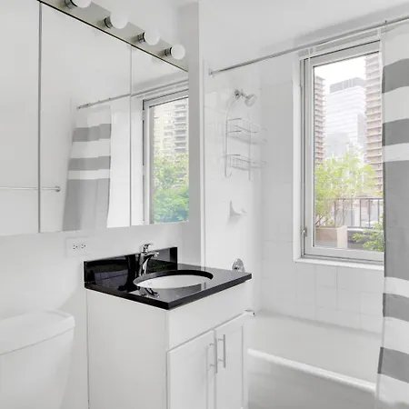 The apartment features views of the city and comprises a balcony equipped with climate control. Blueground Lincoln Square Balcony Nr Riverside Park Nyc-844 apartment features a bathroom with a hair dryer, bath sheets, and towels.