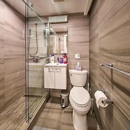 To ensure your comfort, a separate toilet and a shower are provided at Modern 2 Bedroom Retreat In Downtown Manhattan apartment. Moreover, there are a hairdryer, dressing gowns, and towels as well.