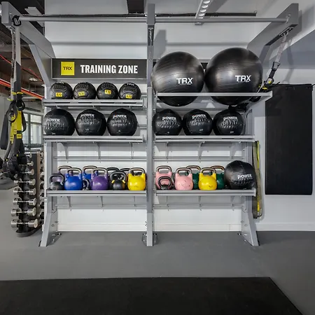 A fitness area, along with fitness classes, is included at Placemakr Wall Street hotel to help guests maintain their physical well-being.