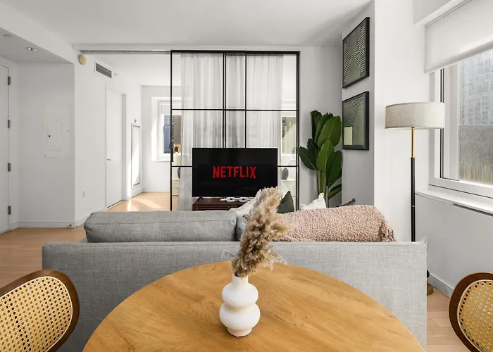The accommodation offers a fully equipped kitchen complete with oven and a dishwasher. The apartment is only 0.6 miles from New York Airport Service bus station and in proximity to 42nd Street-Bryant Park/Fifth Avenue subway station.
