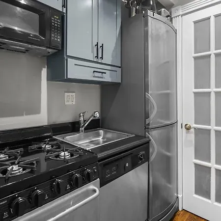 Take delight in a fully furnished kitchen provided at Trendy East Village Escape apartment and complete with an electric kettle, a fridge, and a kitchenware for your convenience. The property is approximately 400 feet from Astor Place subway station and fairly close to Saint Marks Place & 3rd Avenue bus stop.